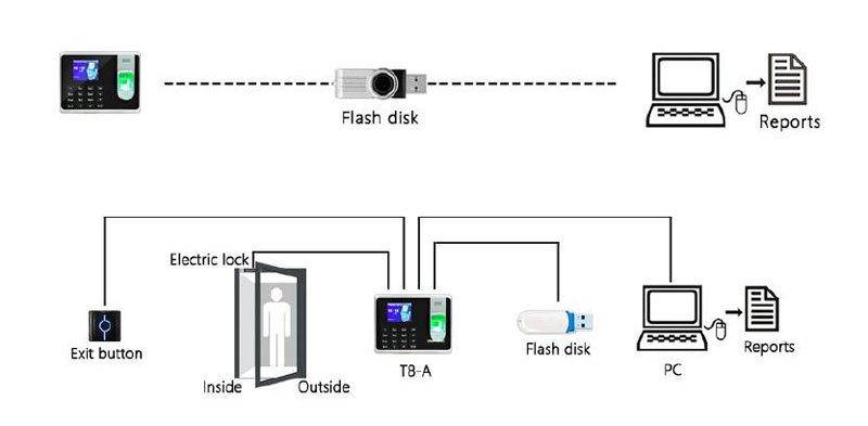 Máy chấm công ronald jack T8A kết nối được với máy tính thông qua cổng kết nối USB và TCP/IP nhằm hỗ trợ việc xuất dữ liệu ra Excel (bảng chi tiết, tổng hợp ngày/tuần/tháng, số giờ làm/tăng ca/đi muộn/về sớm,…) đầy đủ và chi tiết nhất.